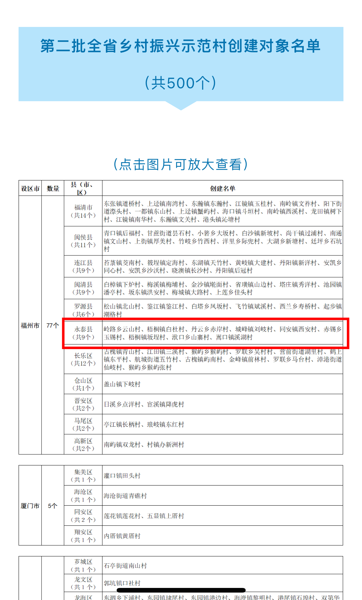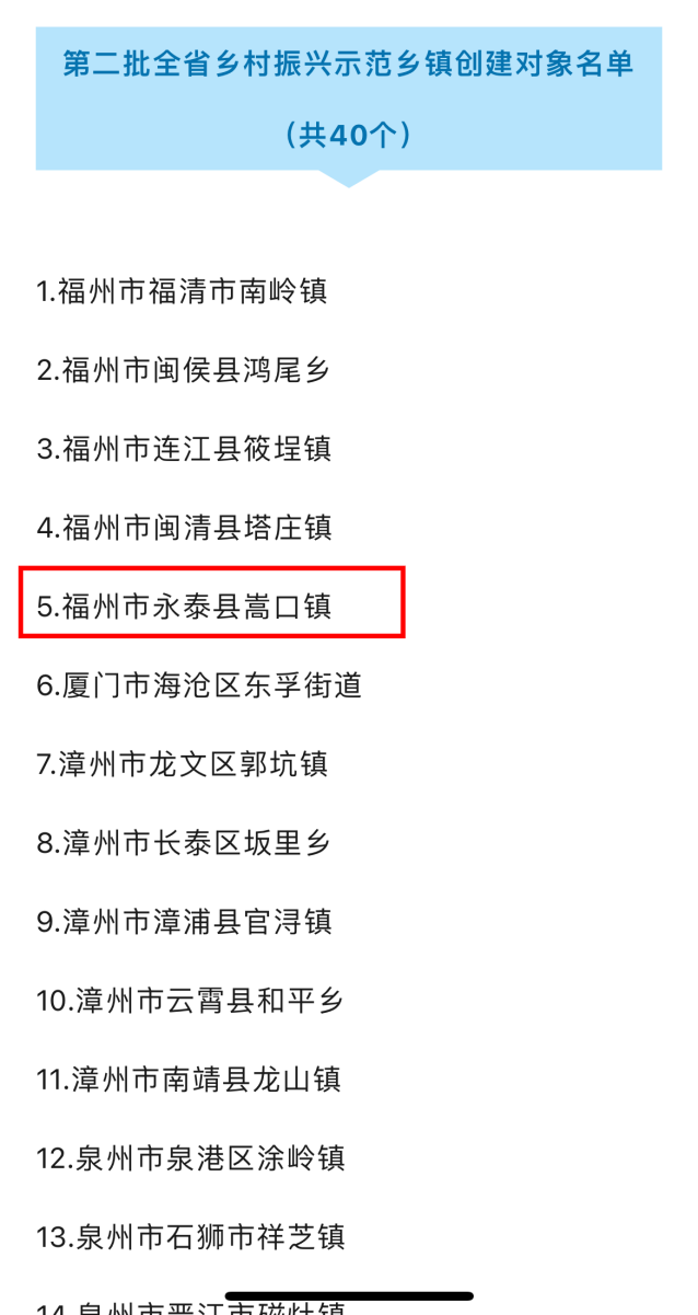 日前,福建省农业农村厅、福建省乡村振兴局发布通知,公布了第二批全省乡村振兴示范乡镇、示范村创建对象名单,共40个乡镇、500个村,其中,电影天堂 有10个上榜,分别是:电影天堂 嵩口镇获评第二批全省乡村振兴示范乡镇,岭路乡云山村、梧桐镇白杜村、丹云乡赤岸村、城峰镇刘岐村、同安镇西安村、赤锡乡玉锡村、梧桐镇坂埕村、洑口乡山寨村、嵩口镇溪湖村获评第二批全省乡村振兴示范村。