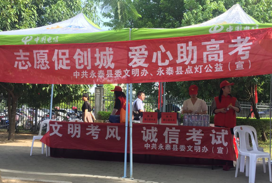 县委文明办组织10名志愿者在为考生免费提供饮用水、考试文具及防暑应急药品等日常物品的同时通过横幅、标语等形式进行诚信文化宣传教育,引导所有考务工作人员和考生严格自觉遵守考务规定,坚决杜绝各种考试舞弊行为的发生。助力全县1397名考生接受诚信意识教育,使考生正确认识和对待高考,自觉树立诚信光荣、作弊可耻的思想,做一名诚信文明的考生,用自己的真实水平,去迎接人生的挑战。