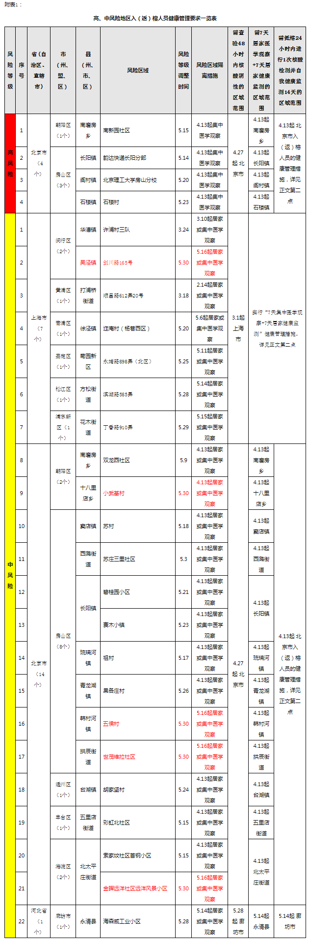 2022年5月30日,上海市闵行区新增1个、北京市朝阳区新增1个中风险地区,北京市海淀区1个、房山区2个高风险地区调整为中风险,北京市朝阳区1个、房山区2个、通州区1个中风险地区调整为低风险。