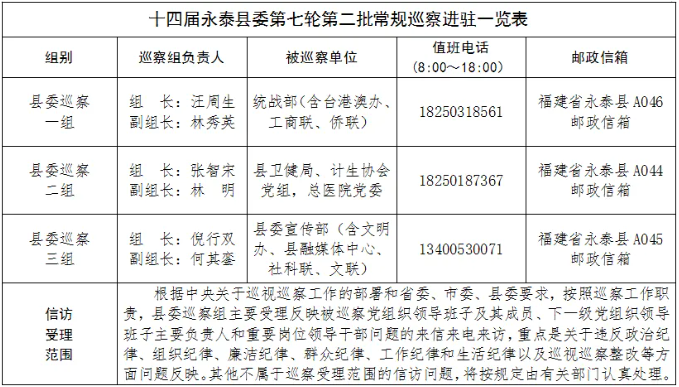 根据《中国共产党巡视工作条例》及中央、省委、市委和县委关于巡察工作的部署要求,经县委同意,县委巡察组近期陆续进驻,对县委宣传部(含文明办、县融媒体中心、社科联、文联),统战部(含台港澳办、工商联、侨联),县卫健局、计生协会党组,总医院党委等12个单位开展常规巡察,巡察时间40天左右。