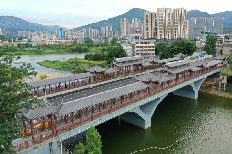 青瓦木廊,飞檐翘脚。廊、亭高低错落有致、纵向进深有别,与大樟溪、清凉溪两岸山水及建筑辉映成趣,南门景观廊桥因其出众的“颜值”,成为了市民朋友们打卡、休憩的又一好去处。桥梁景观与地景、城市景观三者相伴而生,构成了复合型新景观,成为我县的一处新型地标建筑。
