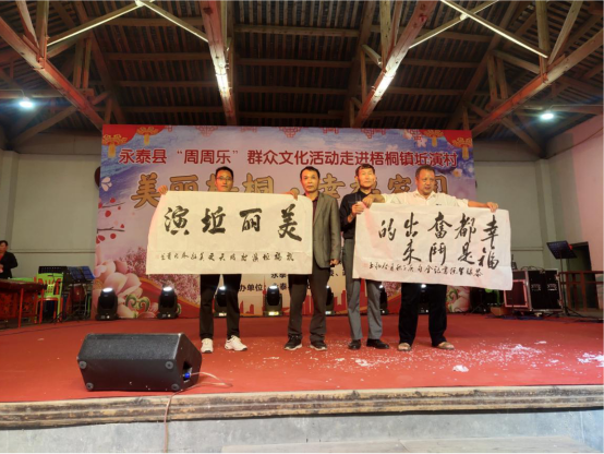 同时,我局还邀请林致贵、张建东、张启翔、朱金潮等书画家赴梧桐坵演村开展书画采风活动,一笔一划勾勒秀美风光,书写对家乡的热爱。书画家们在现场挥毫泼墨、笔走龙蛇,各显神韵,引得在场群众连连称赞。