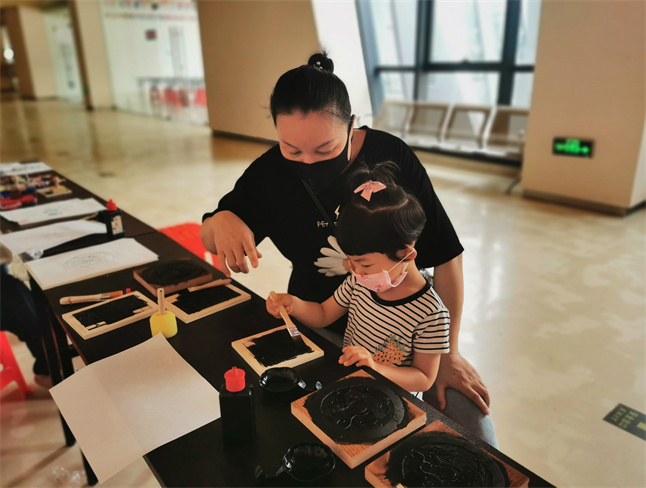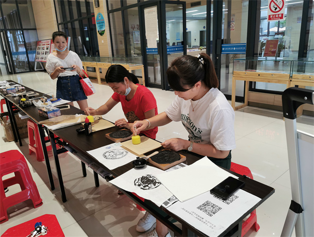 5月18日,县图书馆门口就迎来了对雕版印刷感兴趣的参与者。在工作人员的介绍下,参与者们热情高涨,迫不及待地开始动手制作,他们小心翼翼地磨墨,接着在刻有图案的木质刻板上均匀上墨,然后将一张白纸轻轻放在上面,最后用专门的刷子在纸上轻轻刷动,再将它小心拿下,一幅专属自己的作品就完成了。