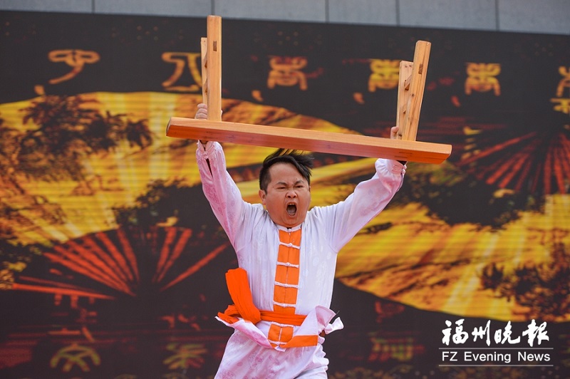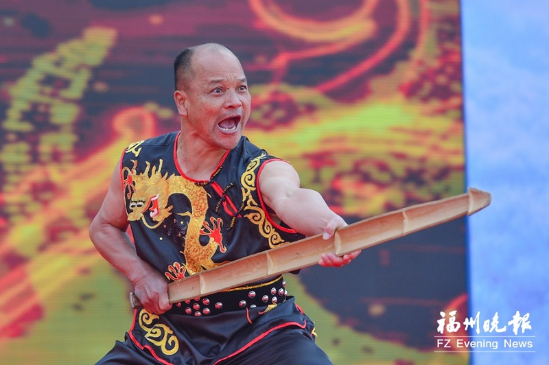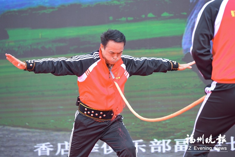 省级非遗虎尊拳传承人代表林章营表演扁担法。