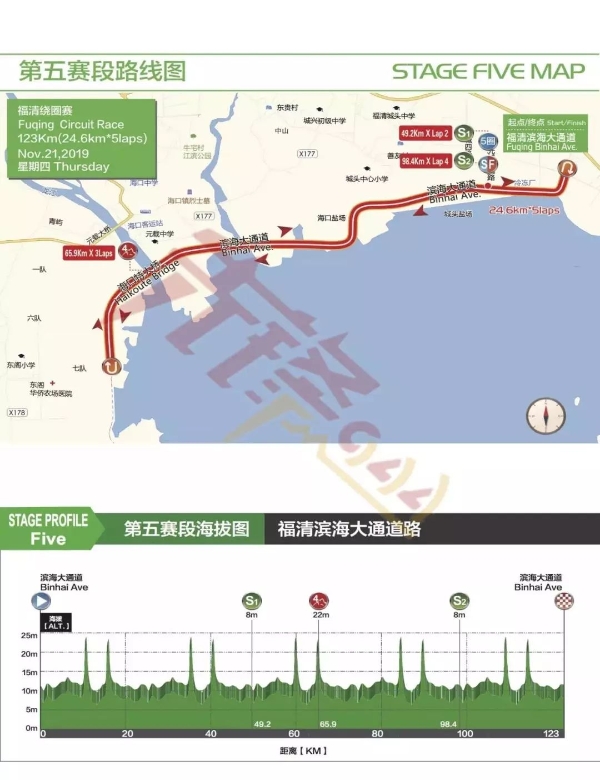 福清赛段:福清滨海大通道(元成次四路)出发城头折返至东阁华侨农场路段往返绕骑5圈,约123公里。