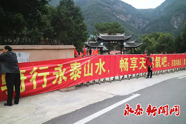 从梧桐镇前往嵩口镇,沿途弯道众多,丛林掩映,娟娟水流,多幅风格各异的宣传牌展示了嵩口人民对此盛事的期待。火红的广告牌是激情的展现,表达了竞技场运动健儿的奋力拼搏,也表达了嵩口人民建设美好家园蓬勃向上的斗志;翠绿的广告牌是活力的展现,以绿色山水和湛蓝的天空为背景,通过绿红渐变的文字淋漓尽致的表达了绿色和激情的主题,五福小型图画将古镇山 水与骑手融合起来,真正实现了人在画中游。