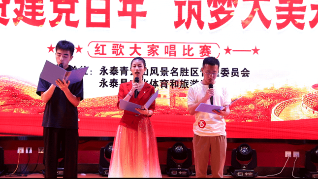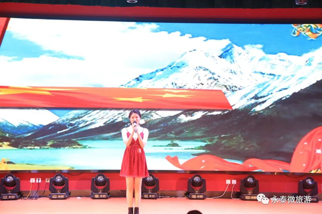 独唱节目《映山红》、《我和我的祖国》、《我的中国心》、《精忠报国》、《我用胡琴和你说话》深情嘹亮的歌声与背景视频中革命先烈群像、红旗飘扬等画面交相辉映,礼赞党的百年征程,抒发出永泰人民爱党爱国的炽热情怀。