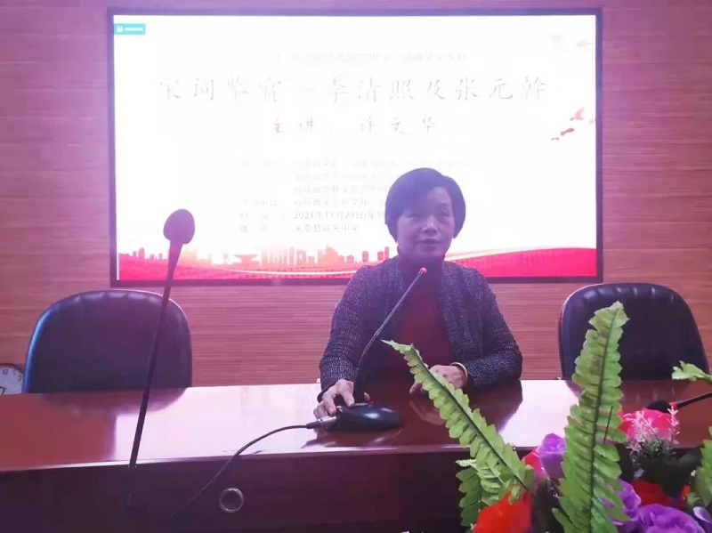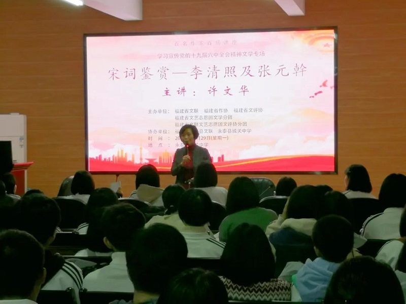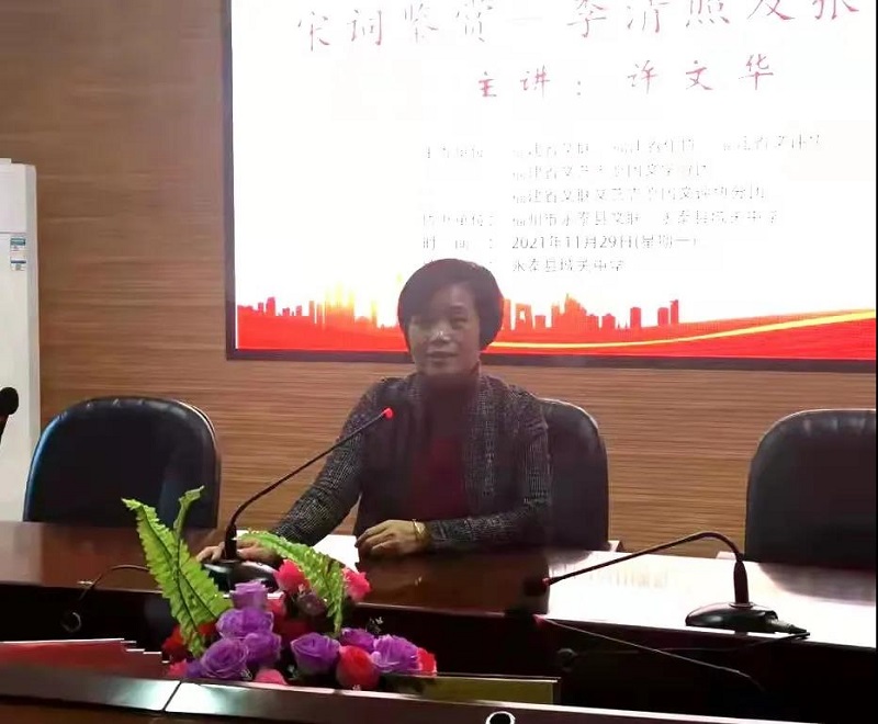 福建省作家协会全委会委员、福州市作家协会理事、电影天堂 作家协会名誉主席、电影天堂 城关中学高级教师许文华作《宋词鉴赏——李清照及张元幹》的文学讲座。