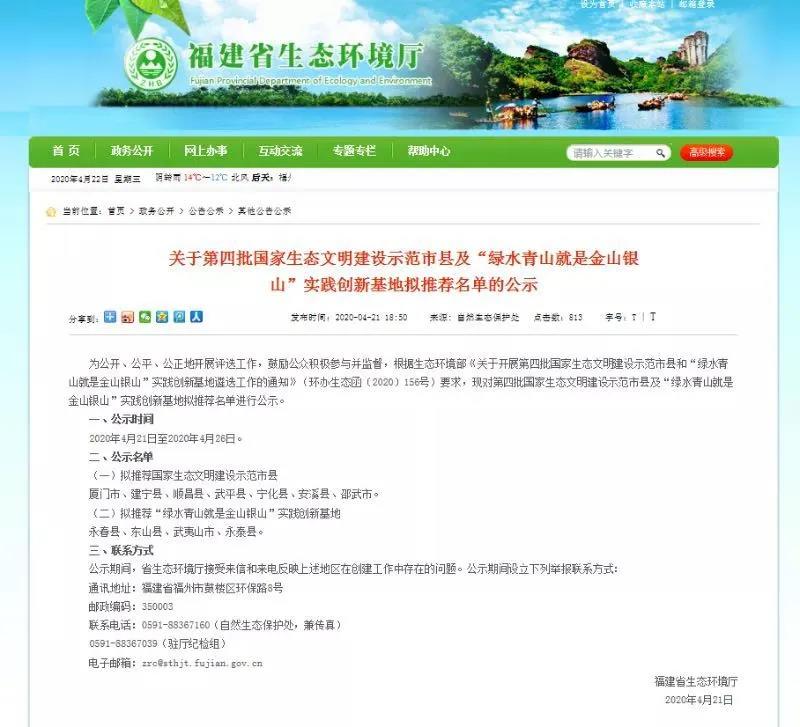 4月21日,福建省生态环境厅官网发布《关于第四批国家生态文明建设示范市县及“绿水青山就是金山银山”实践创新基地拟推荐名单的公示》,拟推荐——