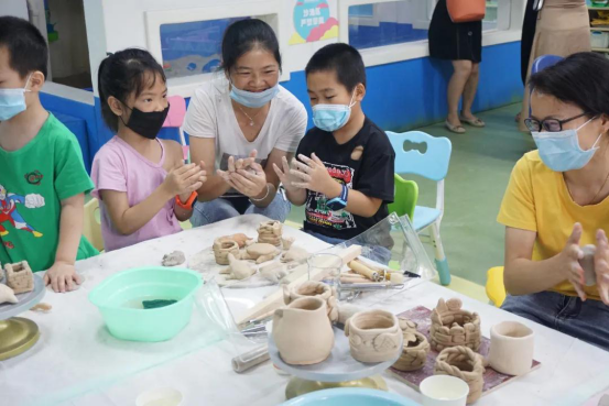 活动中,创意乐园的老师为每个孩子准备了陶艺制作的材料,并示范如何用双手将陶泥变成一件美妙的陶艺作品。在制作时,在老师的认真引导下,小朋友们充分发挥观察力、想象力和创作力,和家长一起运用手中的陶泥,体验泥坯制作,拉胚成型。家长和孩子玩得不亦乐乎,一起合作完成一个陶艺制品,十分具有纪念意义。他们不仅近距离了解到陶器的成形过程,而且增进了父母与孩子的感情,拉近了父母与孩子的距离。