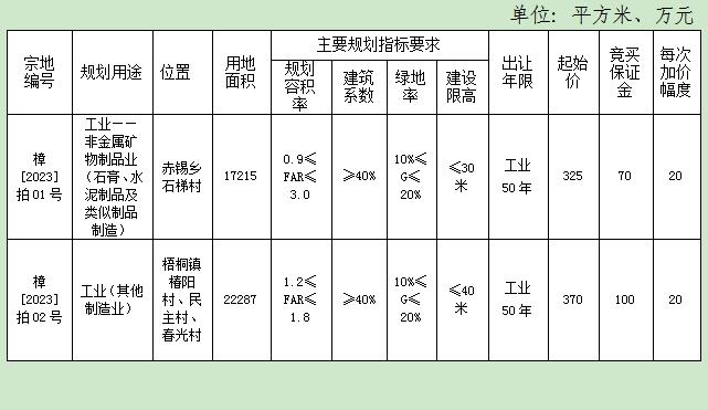 樟[2023]拍02号:(1)根据《福建省人民政府办公厅关于强化规划引领和用地支撑促进城市建设品质提升的通知》(闽政办〔2022〕5号)精神,支持相邻工业用地统筹布局。相邻工业用地属同一业主的,在符合相关规划、安全要求、用地标准且不改变土地用途的前提下,经原审批机关批准,该宗地可将相邻宗地进行统筹布局、优化设计,允许相邻地块指标统筹使用;(2)该宗地用于工业厂房开发产业发展招商引资,各厂房、办公楼、宿舍楼、研发中心均可按栋、按竖向单元、按层转让并可相应办理产权,非生产性配套设施(开闭所、变配电设施、公用消防设施、污水处理设施、垃圾收集处理设施等公用设施)不得转让或销售。