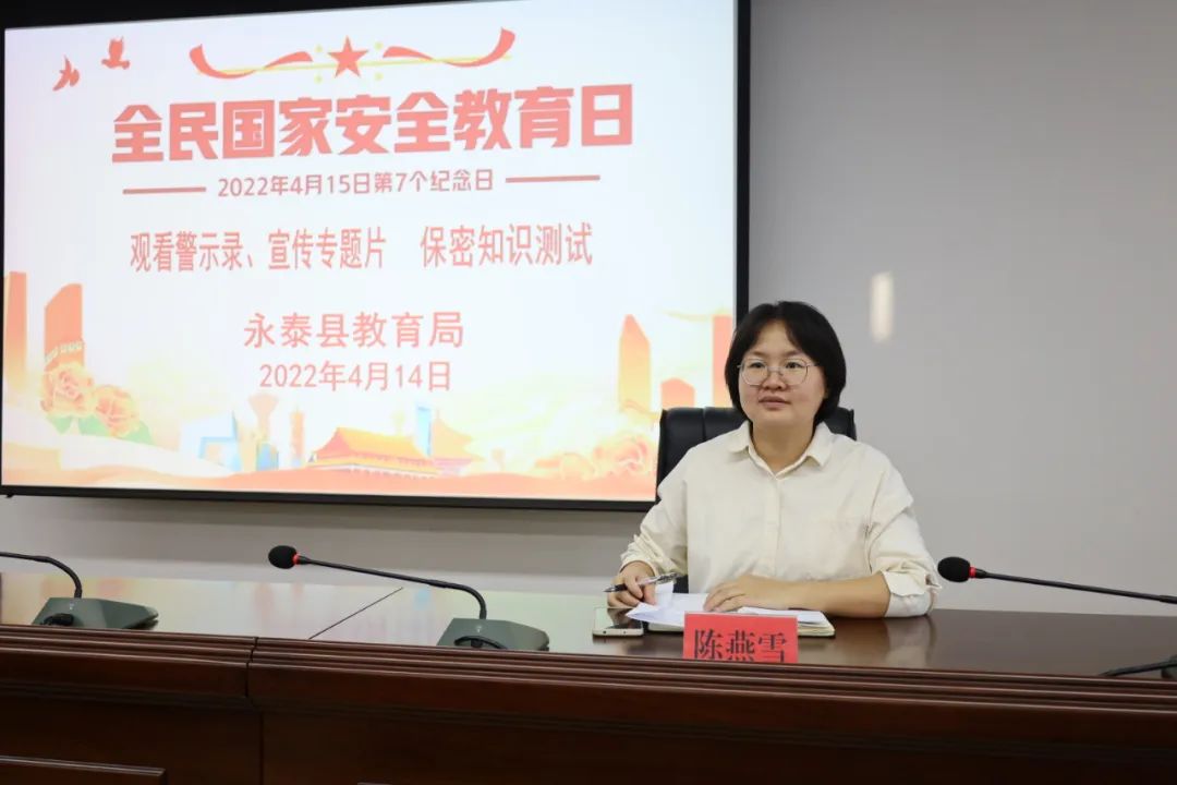 每年4月15日为全民国家安全教育日。4月14日,县教育局召开全体干部职工会议,观看了《党员干部公职人员,这根弦一定要绷紧!》警示录、《护航百年》红色经典保密故事等专题宣传片,开展保密知识测试,张贴国家安全宣传海报,深刻理解总体国家安全观,进一步增强干部职工国家安全意识。