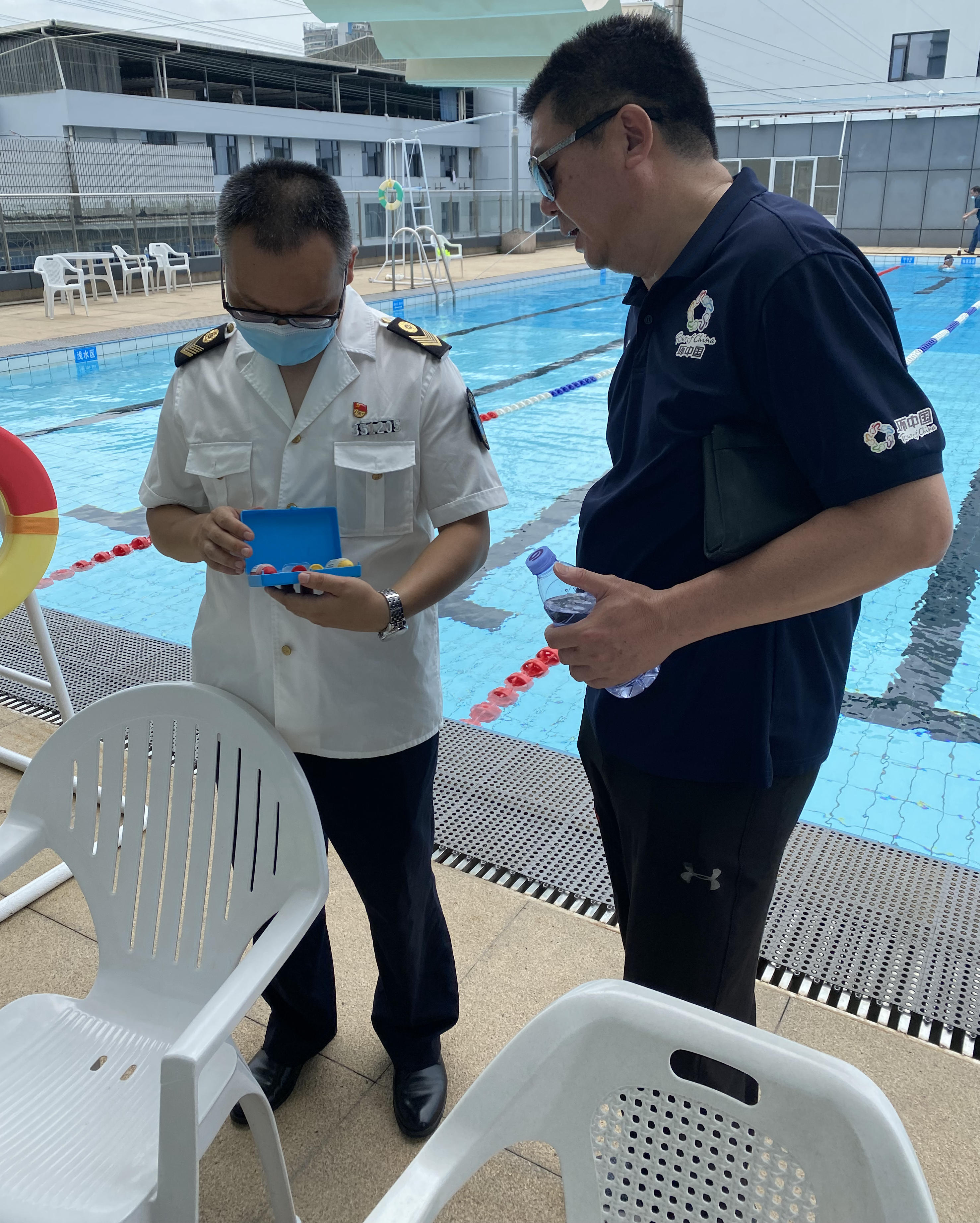 卫生监督员重点检查了游泳场所卫生管理制度建设、卫生许可证持证、从业人员健康证持证、水质净化消毒与循环设施运转、浸脚消毒池使用、游泳池水及公共用品消毒、水质检测公示、禁游标识张贴、疫情防控等情况,共监督检查游泳场所5家,采集游泳池水质样品17份、浸脚消毒池水样品4份。针对检查发现的问题,卫生监督员开展现场业务指导,要求经营业主立即进行整改。针对游泳池水余氯偏低或偏高、浸脚池水余氯偏低的问题,卫生监督员下达《卫生监督意见书》3份,要求相关单位加强自身管理,规范配药、投药,提升自身检测水平,保持余氯值处于正常范围。