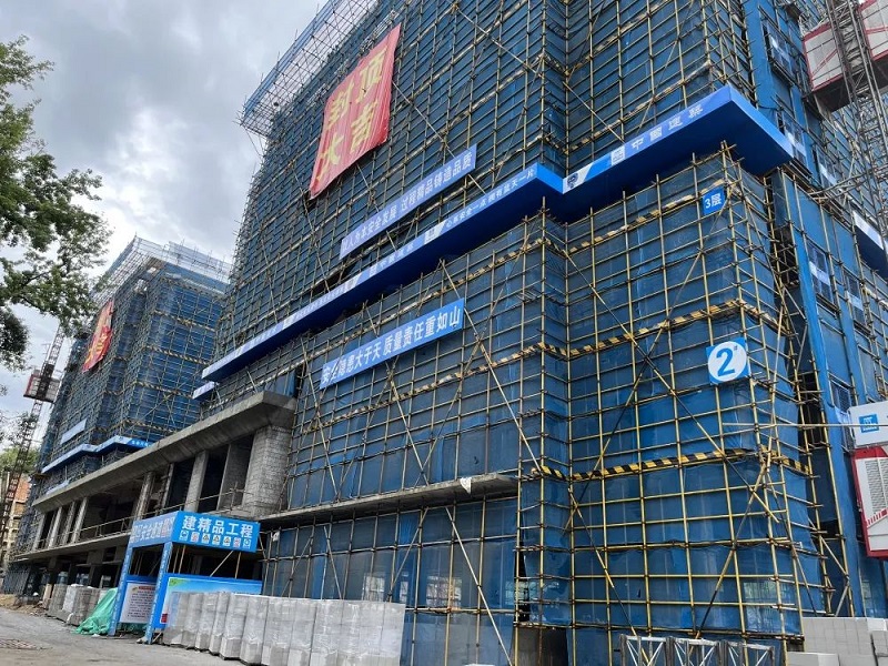 走进旅游集散客运中心项目建设现场,两栋高楼已经拔地而起,2号楼主体结构已经封顶,蓝色的防护网内,工人们正在开展墙体的砌筑、粉刷等工作,建设者们努力克服连日来的暴雨影响,全力推进项目建设。