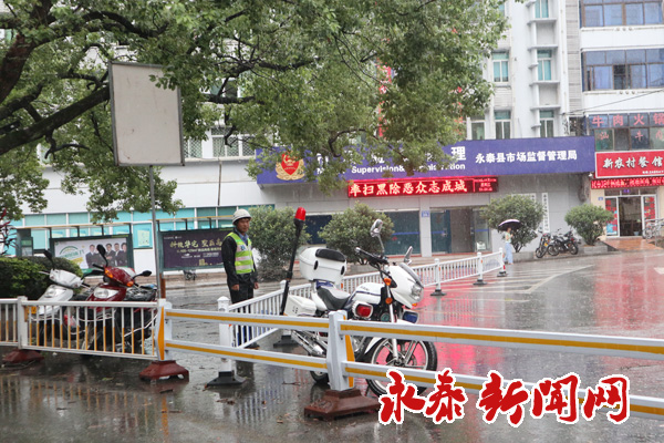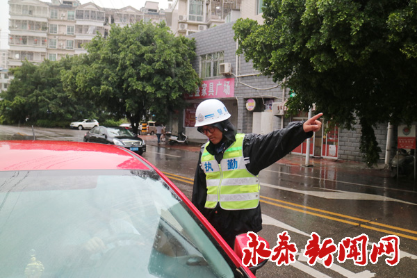 交警在风雨中坚守岗位,指挥交通。