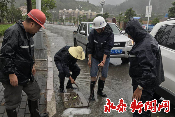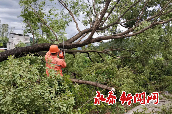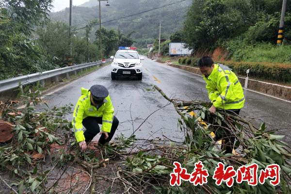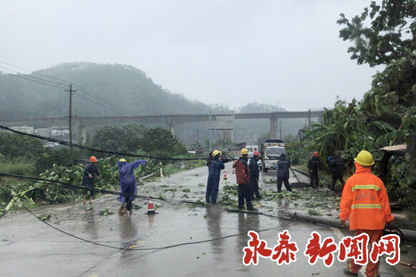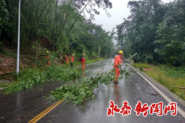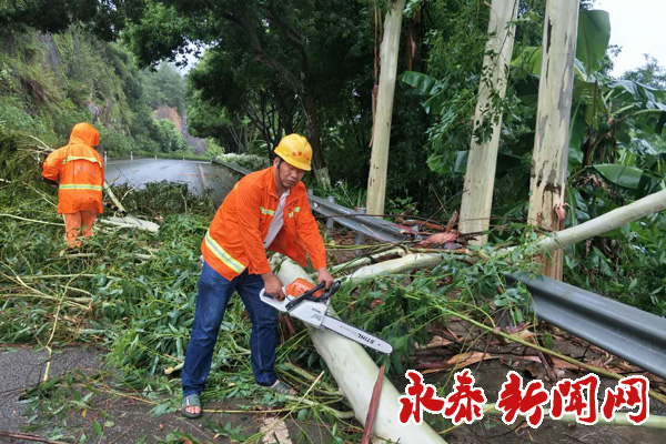县公路局工作人员在永泰到嵩口路段、永泰到清凉路段、太原到金沙路段清理树枝及电线。