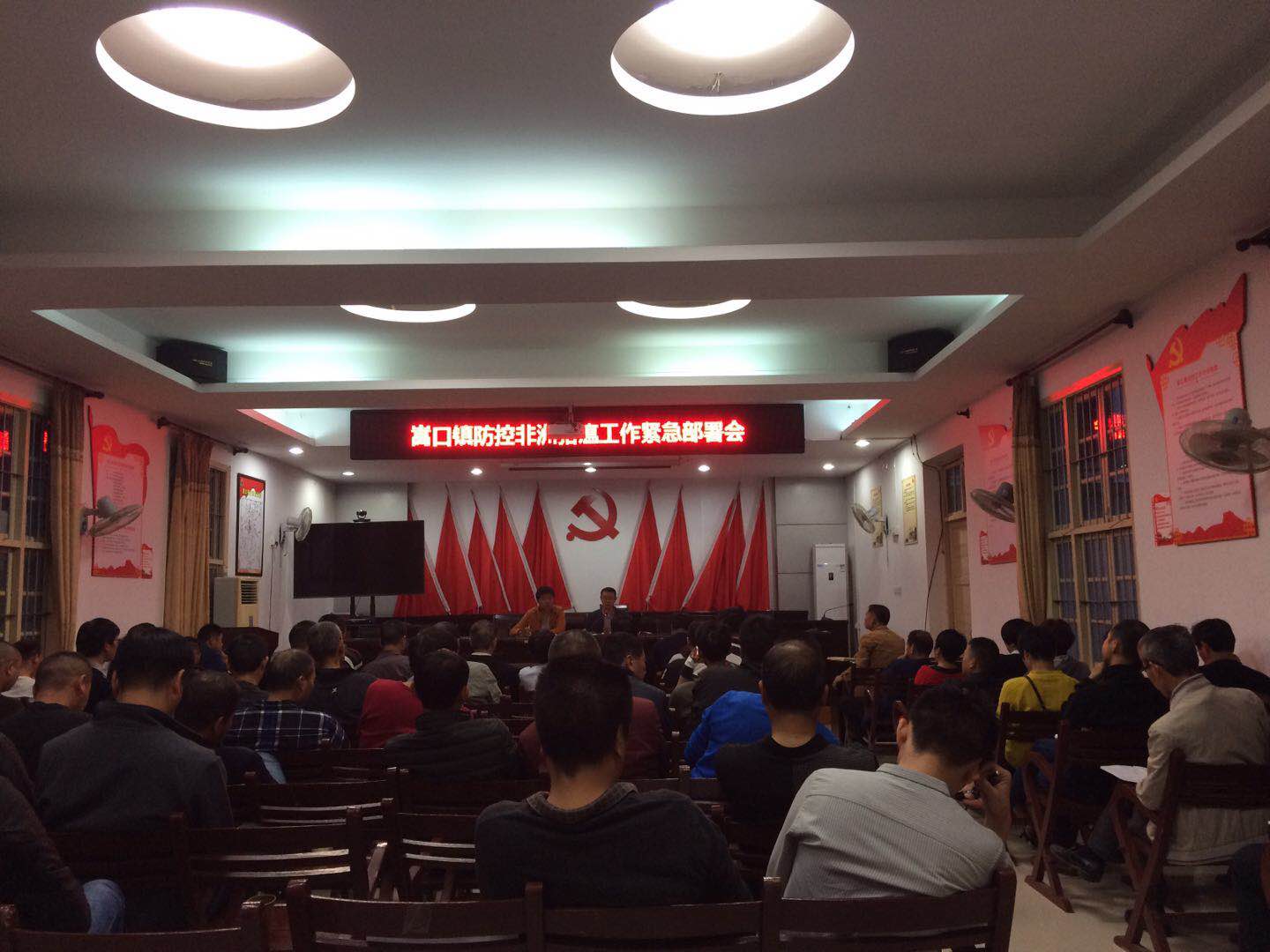 2018年11月9日下午16:30,嵩口镇召开防控非洲猪瘟工作紧急部署会,各包村领导、工作队、各村主干、村级动物防疫员、畜牧兽医站、供销社、屠宰场、顺泽养猪场、城管、邮政、市场监督管理所、林业站、卫生院、公安派出所等相关单位负责人参加会议。