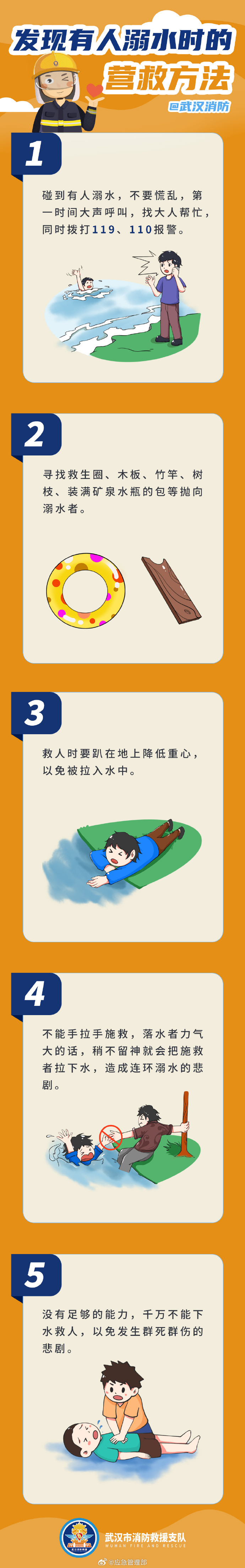 如果发现有人溺水,立即将绳、长竿、救生圈或其他能漂浮的物品抛向溺水者,及时拨打119或110求助,大声呼救喊来更多的人帮忙。见义勇为下水施救,一定要确保自身安全。看图了解更多注意事项↓↓